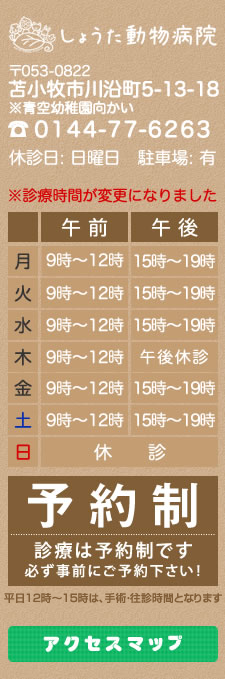 しょうた動物病院では、それぞれのペットに一番合ったオーダーメイドの治療方法を飼主さまと一緒に探していきたいと考えています。